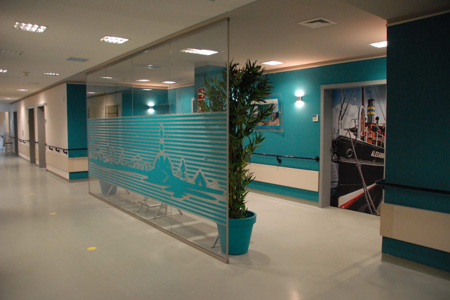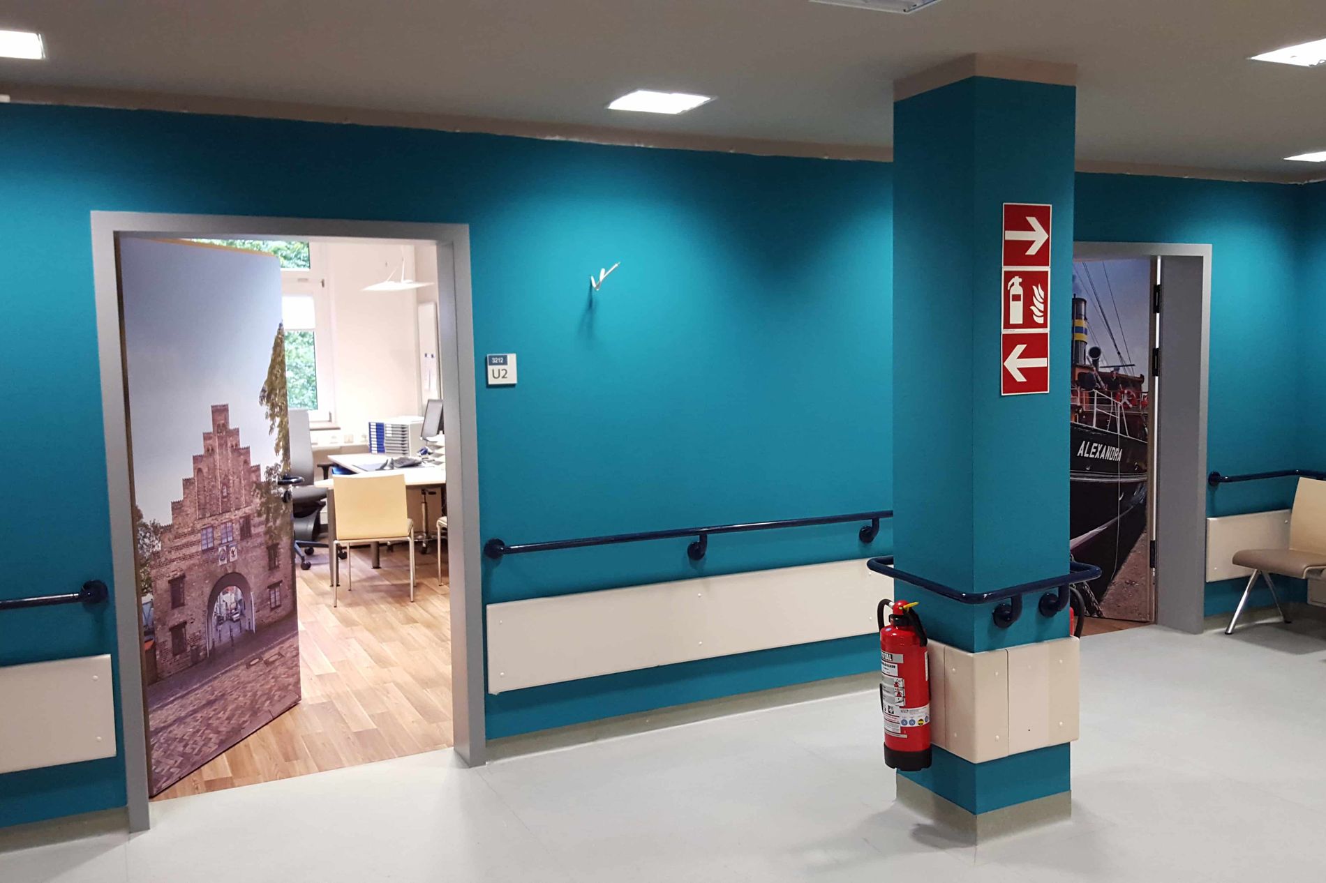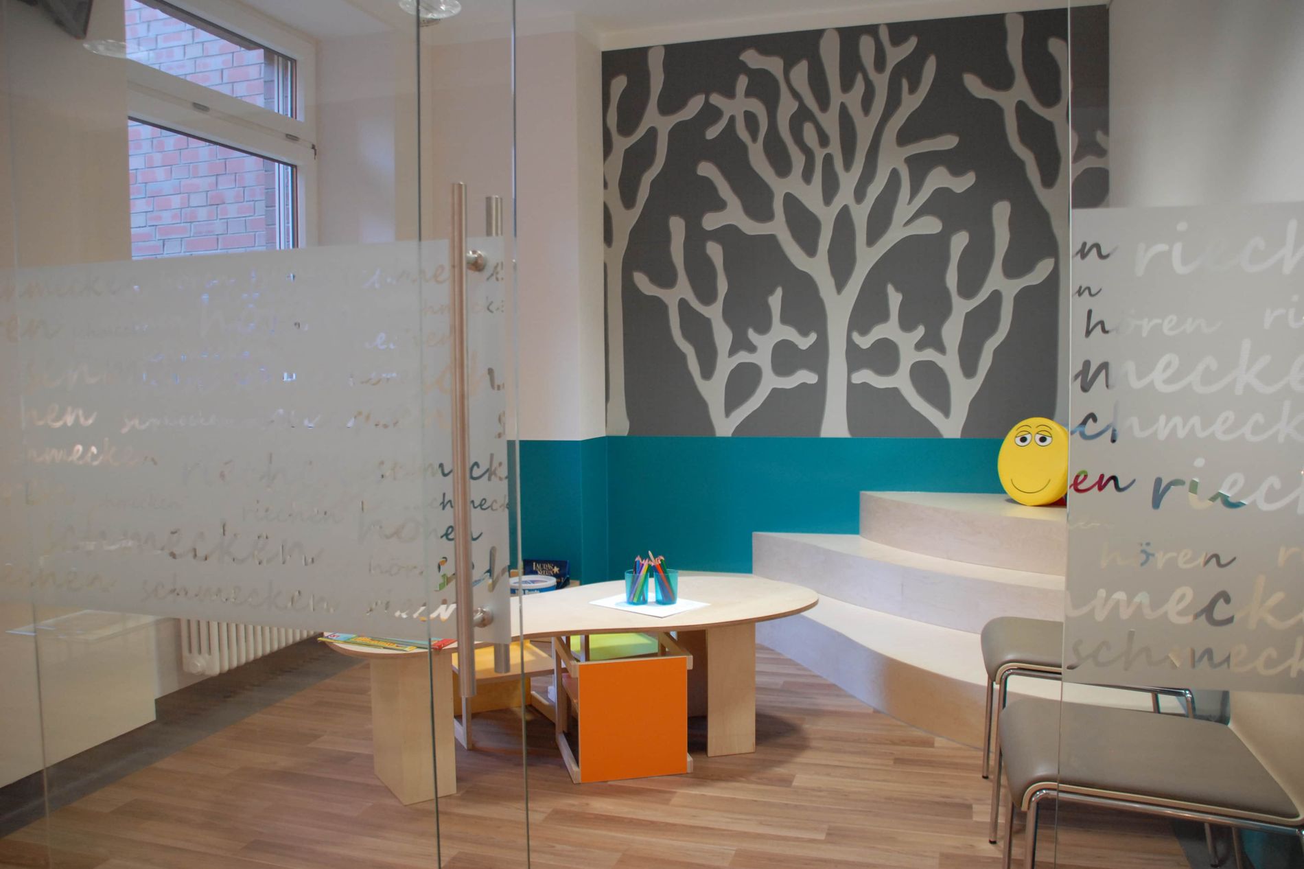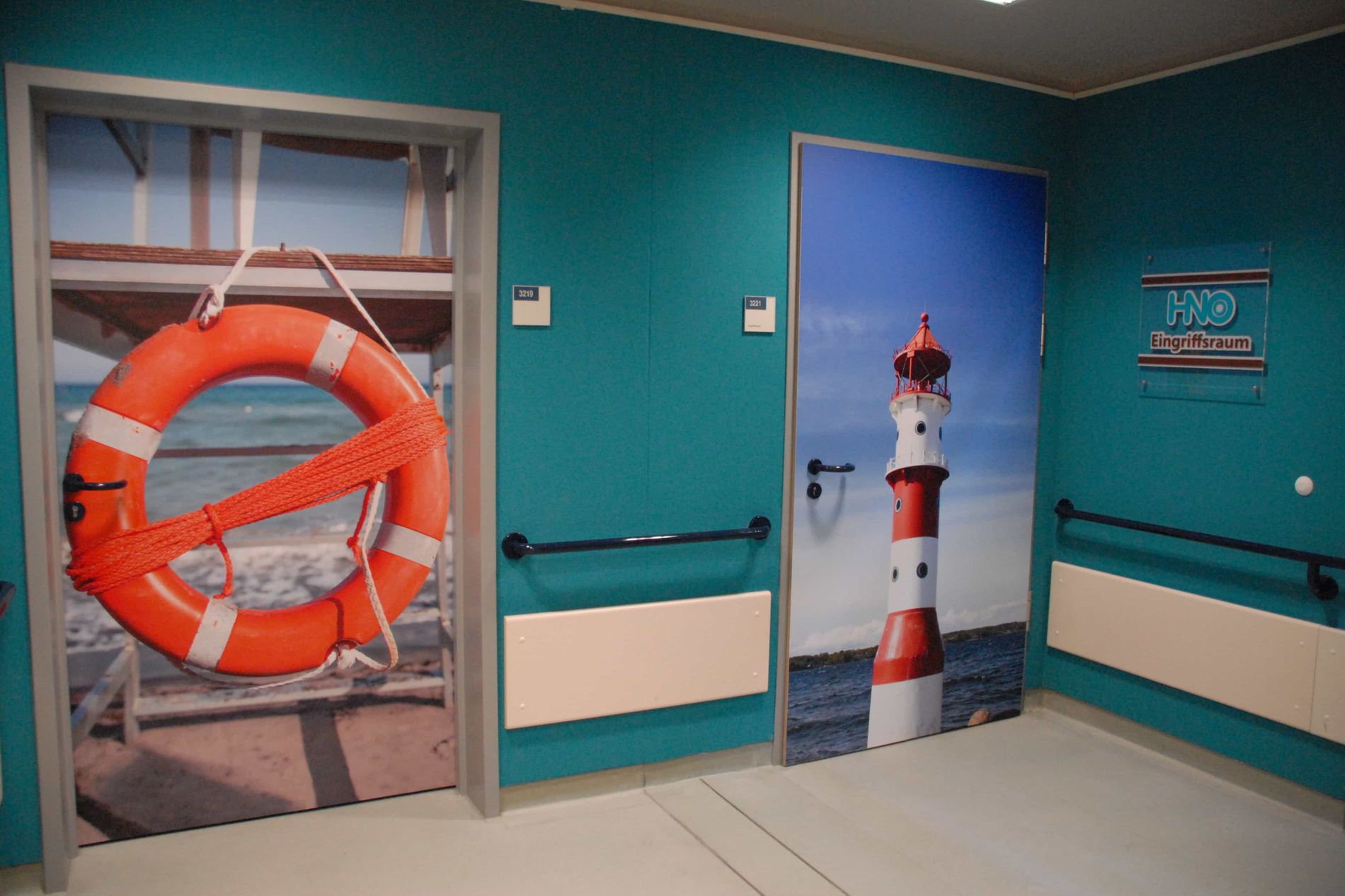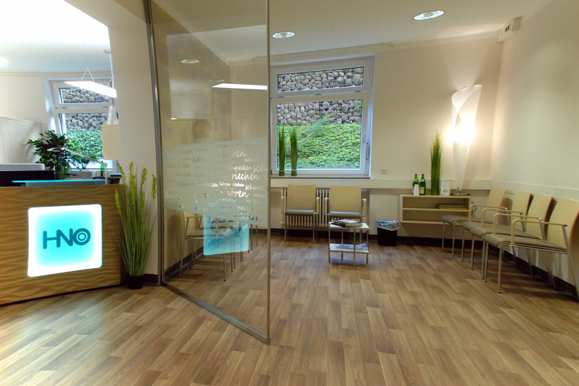 Wir freuen uns, unsere Patientinnen und Patienten in mordern gestalteten Räumen begrüßen zu können. Die Anmeldung unserer HNO-Ambulanz umfasst neben bequemen Sitzmöbeln auch eine Kinderspielecke. Für Diskretion sorgen Glaswände. Das Farbkonzept zeigt Petrol als Leitfarbe mit hohem Wiedererkennungswert. Die Türen sind mit Motiven aus Flensburg foliert und bringen ebenfalls Leben und Motivation in unsere Räumlichkeiten. Die Behandlungsräume sind hell und runden die freundliche Atmosphäre ab.