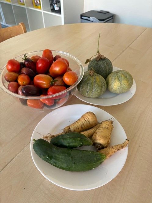Viele der geernteten Lebensmittel nutzten wir direkt in unserer Küche. Die Kinder waren stolz darauf, frische Salate zuzubereiten und die selbst angebauten Zutaten beim Mittagessen zu genießen. Besonders beliebt waren die Erdbeeren direkt vom Strauch – und die Melonen, die zum Ende des Sommers für große Begeisterung sorgten.